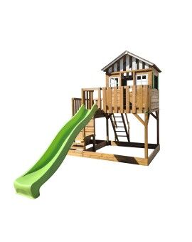 O conjunto inclui todas as madeiras, escorrega verde claro, ancoragens, tampas de parafusos, pegas e instruções detalhadas. A estrutura com baloiço duplo, rampa de escalada e rede de cordas também está incluída.