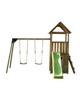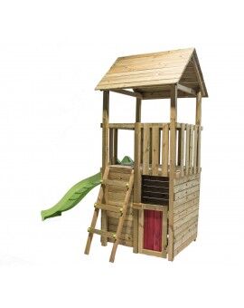 Esta torre de sonho inclui uma casinha de madeira elevada com dois tipos de escadas: uma vertical na parte da frente e outra inclinada na parte de trás. Uma vez no topo, todo um mundo de jogos, vigilância e diversão se desenrola! Para descer, um emocionante super escorregador de 3 metros leva-os rapidamente ao chão.