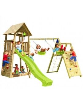 O Parque Infantil Tibidabo da Masgames é entregue com tudo o que é necessário para a sua montagem, incluindo madeira, lona para o teto, parafusos, uma rampa de escorrega de cor verde e ancoragens para o fixar em solo macio de terra ou relva.