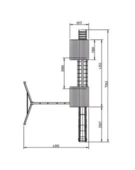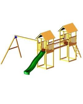 O acesso ao parque é feito através de uma elegante escada de madeira que o levará ao piso superior, localizado a uma altura de 120 cm. A plataforma é protegida por uma grade de madeira que envolve todo o seu perímetro, com exceção da versão com parede de escalada, que tem um lado aberto para facilitar o acesso. Em qualquer caso, a diversão não termina, pois as crianças podem descer pela emocionante rampa do escorrega.